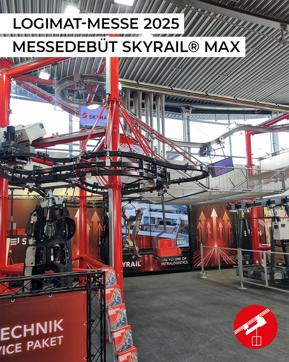 Unser Bereich Fördersysteme war vom 11. bis 13. März auf der LogiMAT in Stuttgart und feierte das Messedebüt der SKYRAIL® Max, unserer neuen Schwerlast-Elektrohängebahn mit 3.500 Kilogramm Nutzlast.