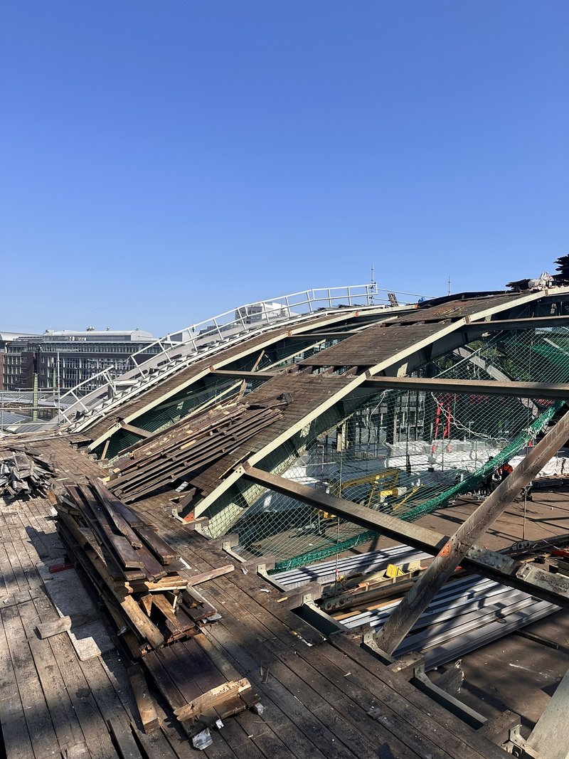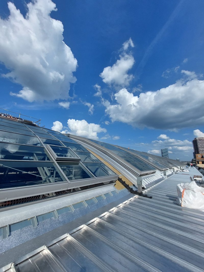In der letzten Woche haben wir den Abbruch des letzten alten Oberlichts der Südhalle erfolgreich durchgeführt. Auf den Bildern siehst du Oberlichter in unterschiedlichen Zuständen im Vergleich: Bild 2 zeigt das Oberlicht bei Abbrucharbeiten während auf Bild 3 ein neu montiertes Oberlicht zu sehen ist.