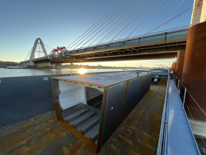 Am 05.09.2023 wurden die letzten Bauteile zum Lückenschluss der ersten Richtungsfahrbahn der Rheinbrücke Leverkusen geliefert und montiert. Das SEH-Team hat vom Schiff aus die letzten Hauptträger, mit Hilfe der roten Derricks, eingehoben. Ab Ende Januar 2024 soll der Brückenneubau für den Pkw- und Lkw-Verkehr freigegeben werden.