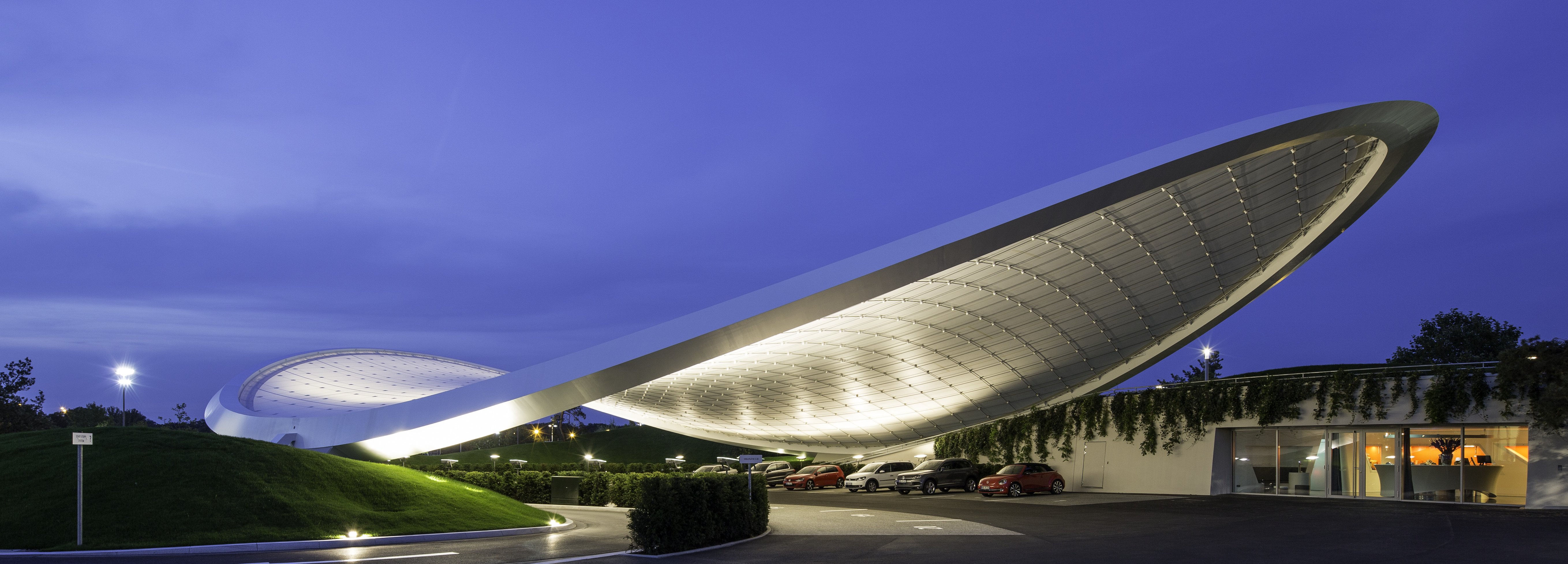 Die zugehörige Parkplatzfläche ist mit dem geschwungenen Dach überspannt. Das Dach hat die Form einer doppelt gekrümmten Sattelfläche (hyperbolischer Paraboloid). Es fügt sich harmonisch entsprechend der architektonischen Idee "wie ein Blatt in der Landschaft" in die Ausfahrt des Kundencenters ein.