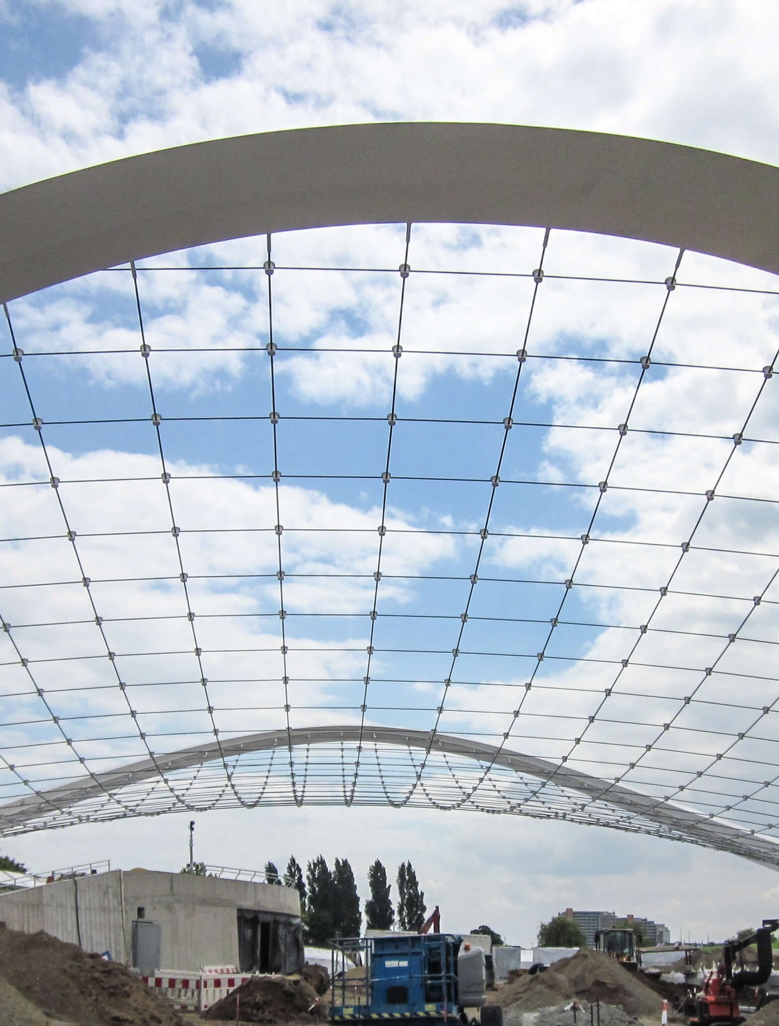 Der Querschnitt des Randträgers besteht aus einem veränderlichen Fünfeck und verjüngt sich von den Fundamenten bis zu den Firstpunkten. Die Flächen des Randträgers bilden, bedingt durch die Dachform, gekrümmte Oberflächen. Der Randträger ist in 2 Fundamentblöcken eingespannt. Die Dachmembran aus PTFE-beschichtetem Glasfasergewebe ist auf einem Seilnetz, Raster 1,50/1,50 m befestigt und mit dem Randträger verspannt.