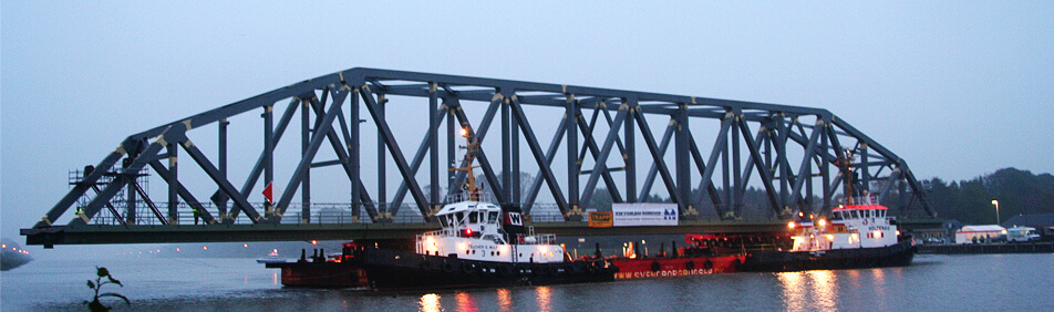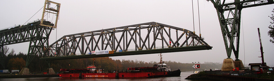 Im Dezember 2005 erhielten wir den Auftrag für die Planung, Konstruktion, Fertigung und Montage dieser 121 m langen Fachwerkbrücke, die unter komplizierten Randbedingungen in ca. 40 m über einer Wasserstraße aus- und einzubauen war. Dafür standen weniger als 11 Monate Ausführungszeit zur Verfügung.