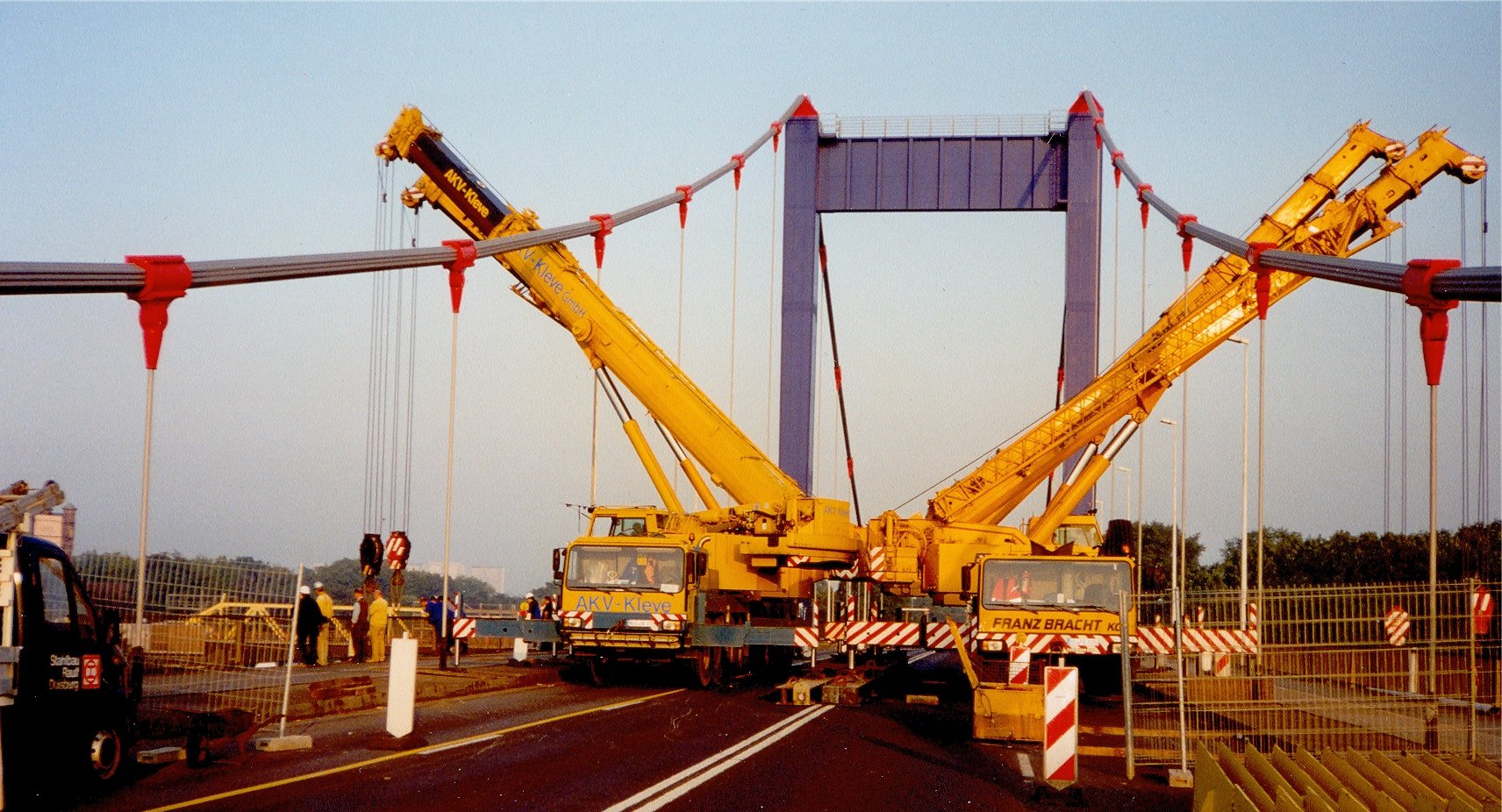 Die Untergurte der Hauptträger wurden im Bereich der Pylone mit bis zu 120 mm dicken Lamellenpaketen verstärkt. Weiterhin wurden die Betonplatten der Geh- und Radwege durch eine orthotrope Stahlplatte ersetzt.