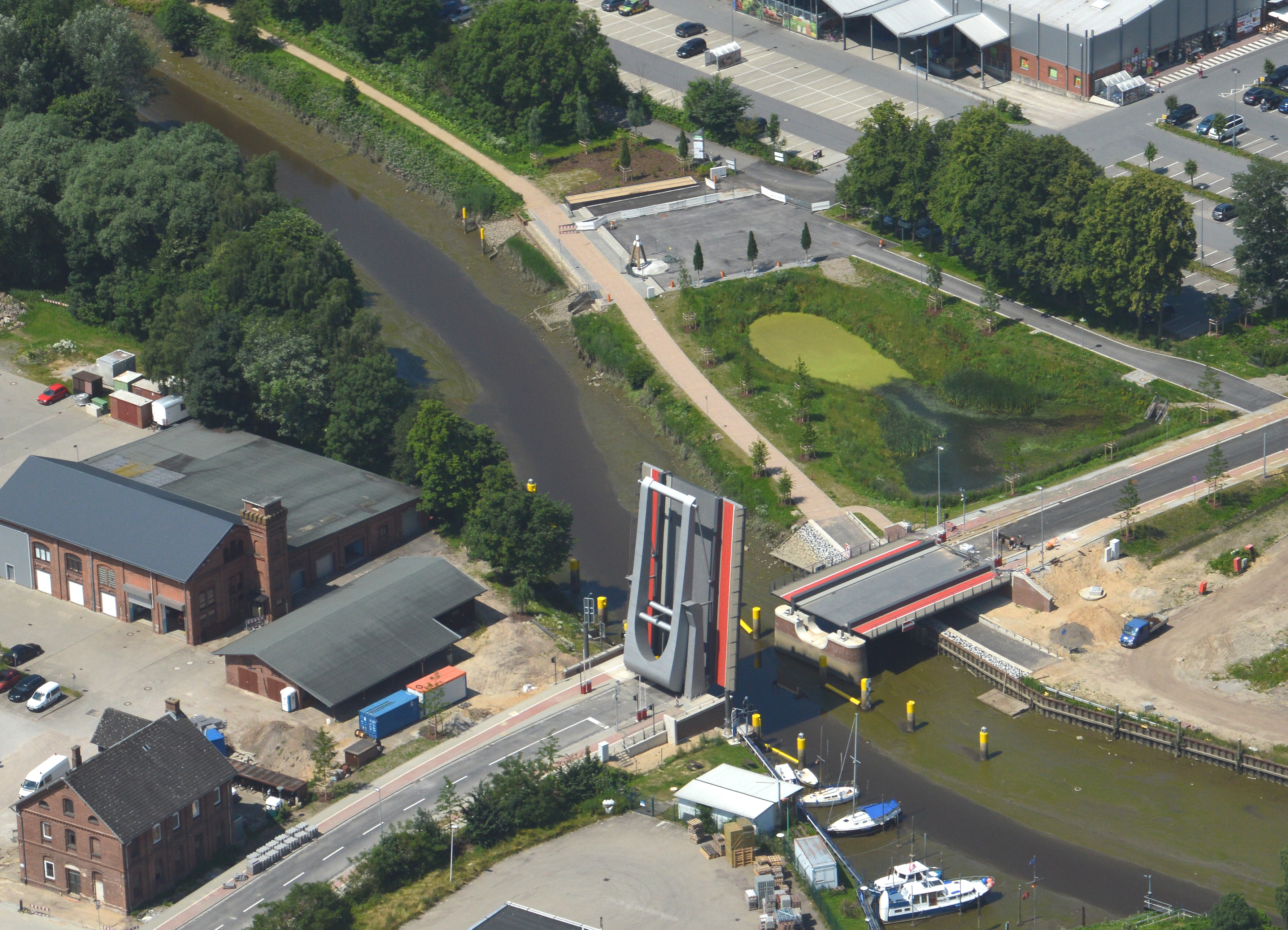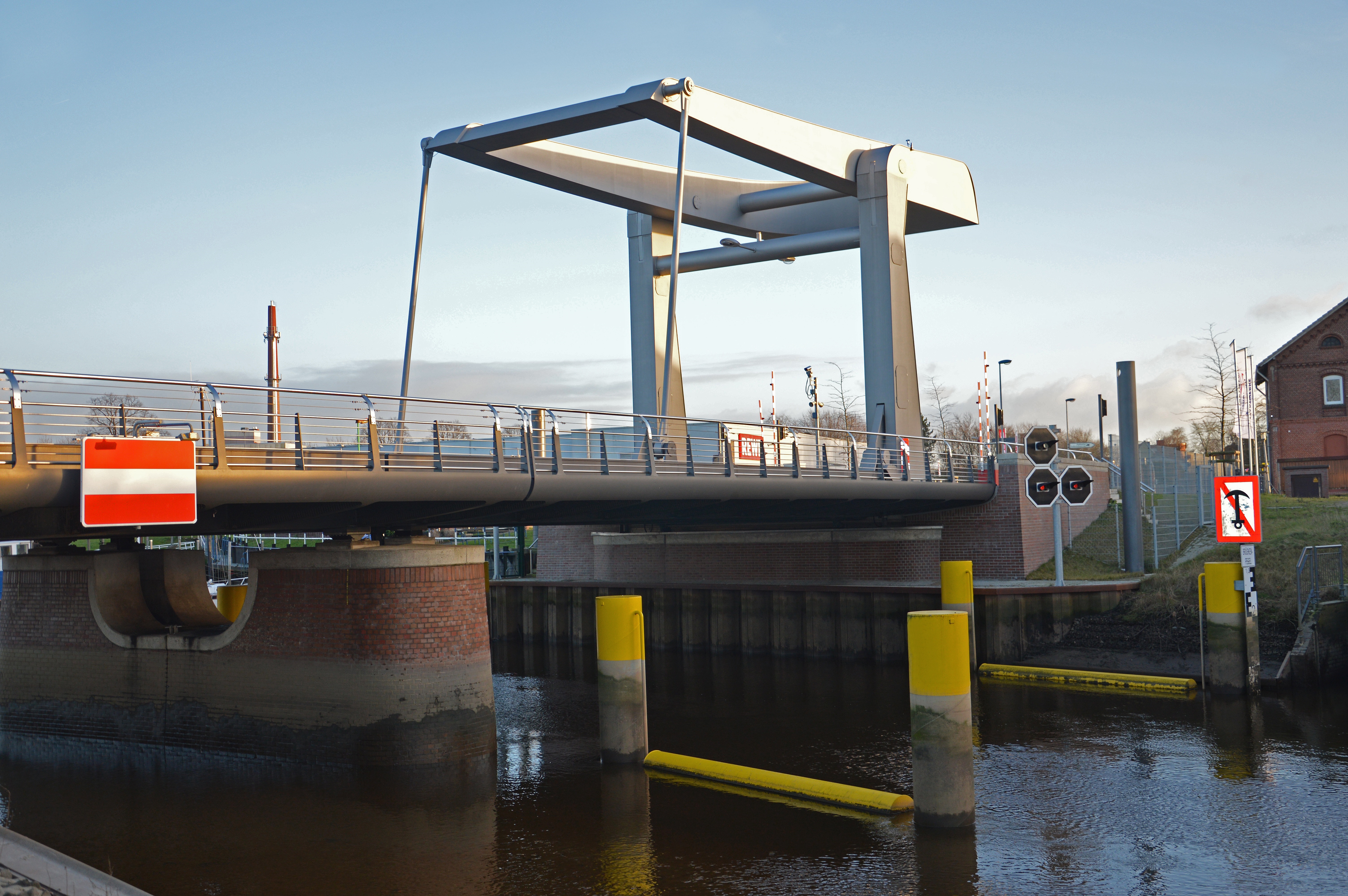 Die Brücke besteht aus einem festen und einen beweglichen Teil mit je 20,0 m Stützweite. Das Gewicht des beweglichen Teils von 100 t wird mit einem Gegengewicht von 100 t ausgeglichen, um die Antriebsleistung der hydraulischen Antriebe beim Hubvorgang zu minimieren.