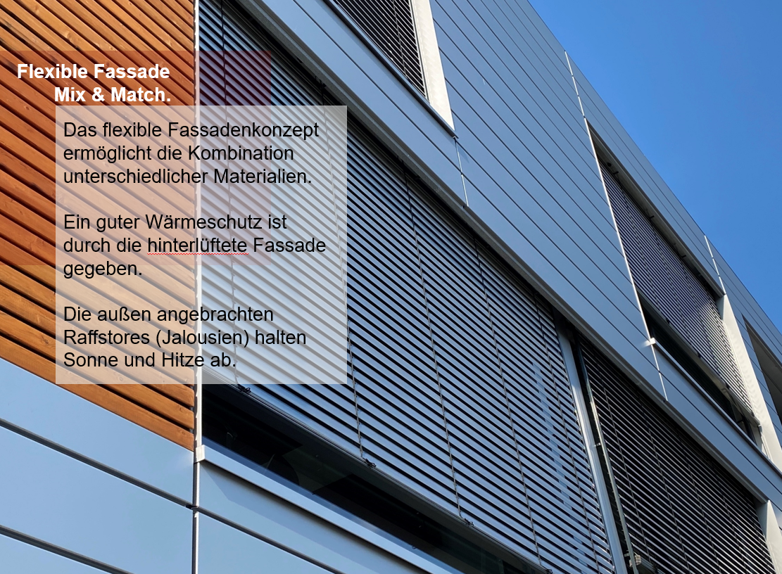 Die aufgeständerte, leichte Stahlkonstruktion ist flexibel erweiterbar und kann beispielsweise durch verschiedene Fassadengestaltungsmöglichkeiten weiter individualisiert werden.