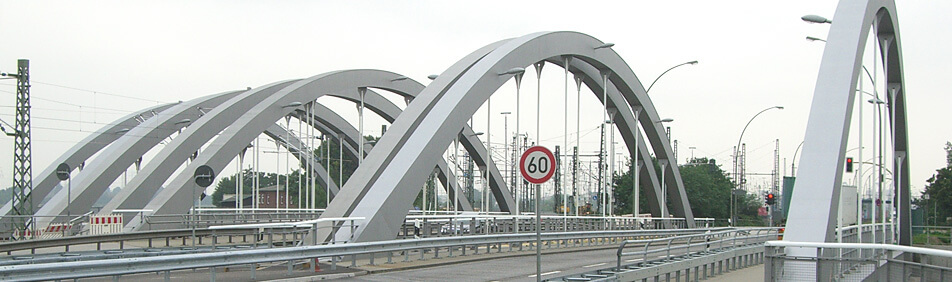 Die beiden Bauwerke 13a und 13b überführen die Gleise der Hafenbahn. Die Bauwerke 182 und 13c überbrücken den Saalehafen für die beiden Richtungsfahrbahnen der Straße Veddeler Damm. Die alten Stahlfachwerkbrücken wurden durch stählerne Stabbogenbrücken mit gleichen Stützweiten von ca. 60 m und durchgehender Schiefwinkeligkeit von 45 ° ersetzt. Die alten Überbauten wurden nacheinander durch die neuen Überbauten ersetzt, wobei die neuen Unterbauten vor die alten gesetzt wurden.